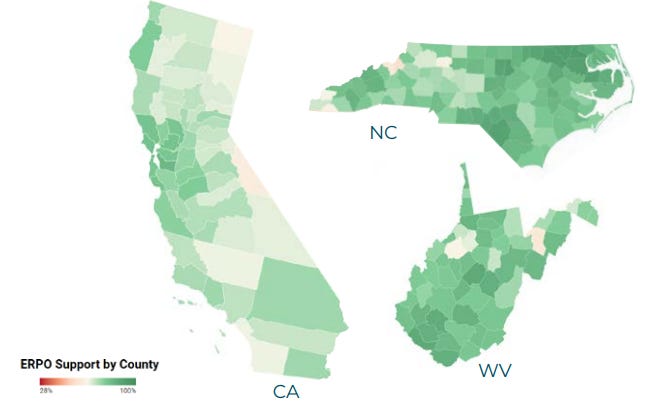 A novel finding by the study is that regional differences in ERPO support contradict traditional red vs. blue state assumptions. Swing state North Carolina and red state West Virginia exhibit strong ERPO support despite their conservative political and cultural leanings. Blue state California, while generally supportive, still contains pockets of variation.