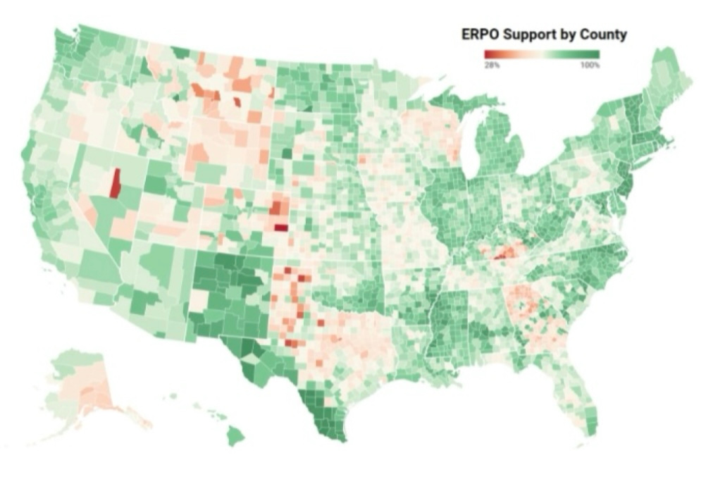 The ERPO model, shown below, visualizes gun owners’ views of ERPO policies in the United States by county. It is based on data from a 97Percent survey answered by 5,100 gun-owning registered voters across the country at the end of 2024, scaled up to create a nationwide picture of similar gun owners.